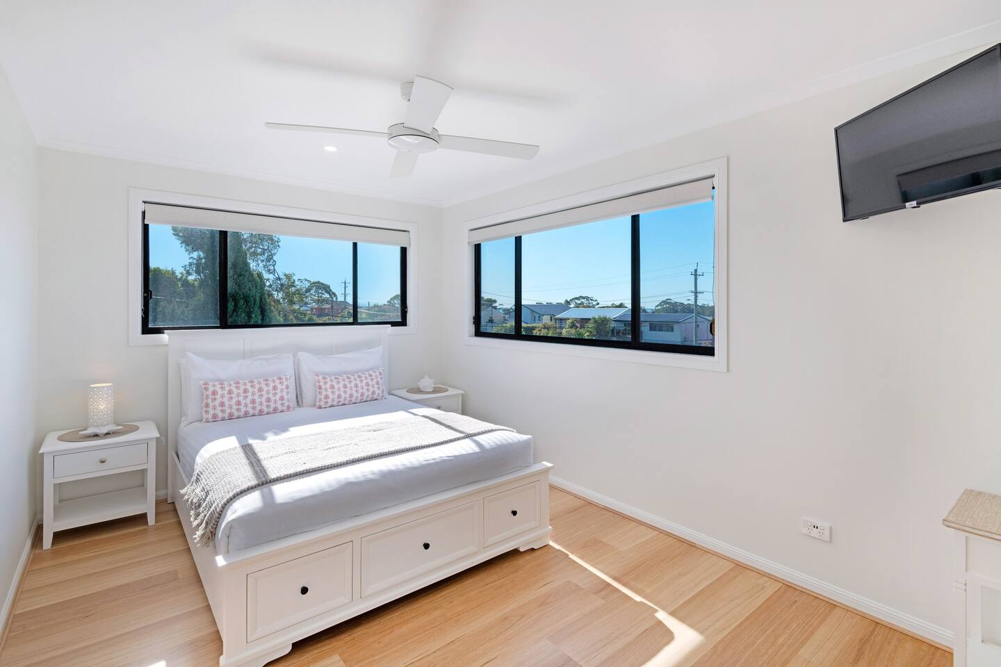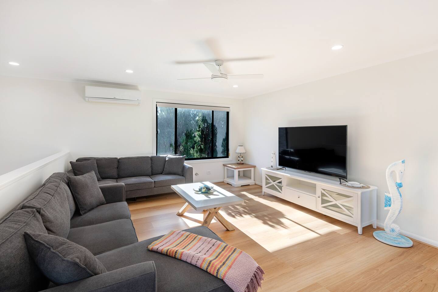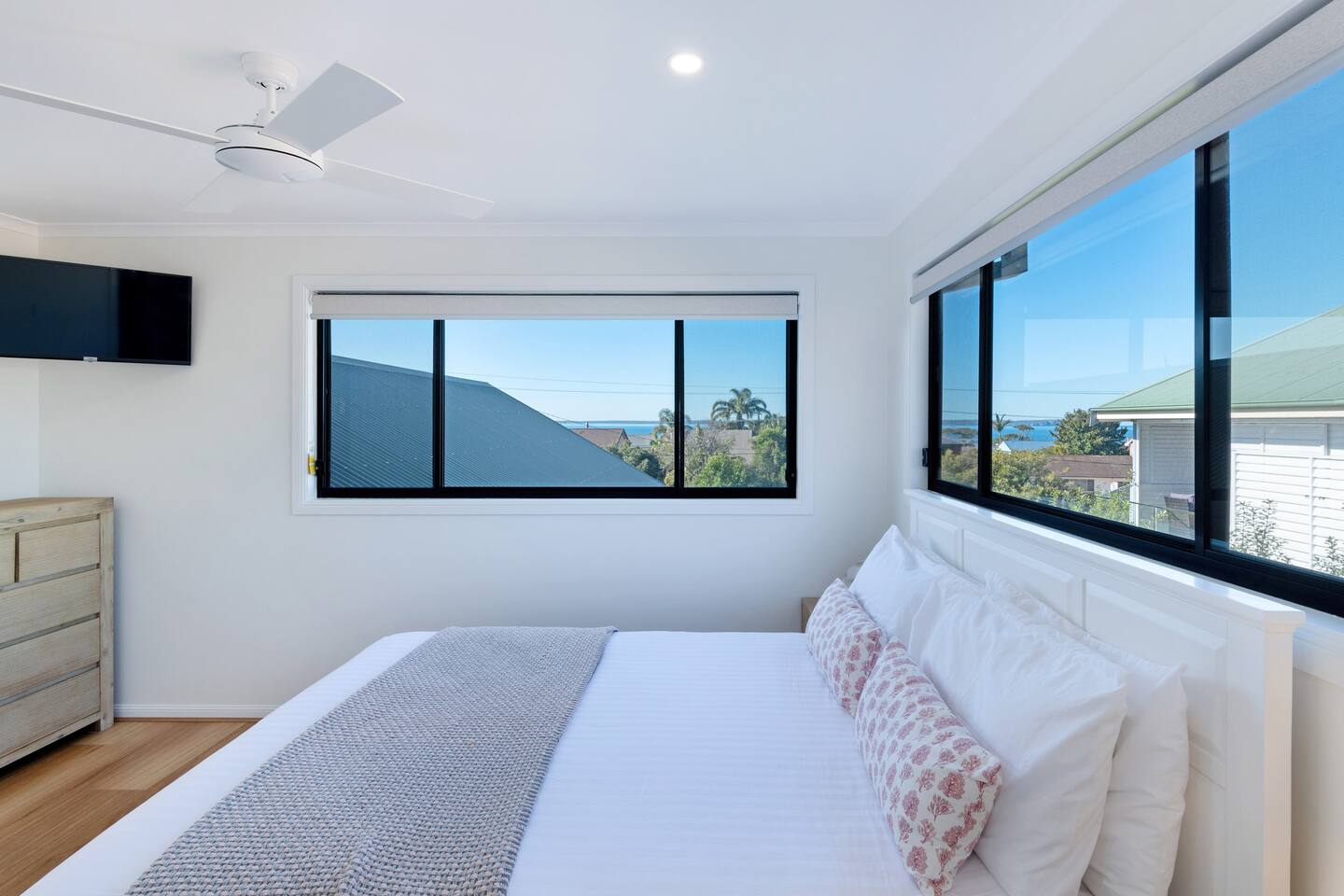 Above by Sanddancers, managed by The FAM Holiday Property Management in Jervis Bay, is a beautiful, spacious and light apartment, perched by Jervis Bay's crystal clear waters and white sandy beaches. This large property has a beautiful open plan living space with a stunning, well equipped modern kitchen, breakfast bar, dining area and lounge featuring smart TV. Concertina doors open up onto a spacious entertaining deck with dining table, lounge and family BBQ, making it the perfect place to relax and enjoy easy holidays. Enjoy views across the bay from two good sized bedrooms featuring new queen beds, walk in robes and TVs. A large, well kept bathroom has a shower and separate corner bath, completing all the essentials for a seamless stay. With its elevated position on one of Jervis Bay's most sought after streets, incredible aspect and plentiful sea air, Above by Sanddancers is not to be missed. What's more, you're in the heart of Jervis Bay, just a couple of minutes to the beach, a short walk to Vincentia's shops or short drive to Huskisson, Hyams Beach and the Booderee National Park. * Best bits of Above by Sanddancers * - Extremely well sized two bedroom apartment, plenty of space for everyone to rest and recharge - Open plan and alfresco living at its best - large deck with lounge, dining and BBQ - Bay views from two large queen bedrooms - Wifi & three smart TVs, found in the living space and each bedroom. Making even rainy days entertaining! - Immaculately kept premises - Modern, well equipped kitchen, breakfast bar - AC and ceiling fans - Linen and towels included - Luxury toiletries and household basics provided - Complimentary bottle of local wine, barista coffee and handmade sweet treat for all our guests - In depth house magazine with extensive insider local tips to make the most of your stay - Off street parking * Need to know * - Sleeps 4 in 2 queen beds (plus infants, bring your own cot) in 2 comfortable queen beds - Internal laundry space with washer and dryer Please note we have an external security camera which monitors our parking area and entry only.