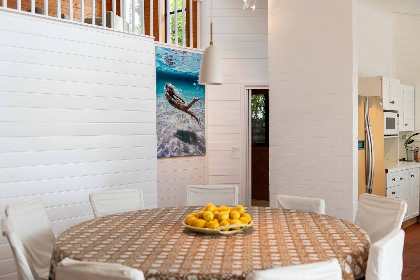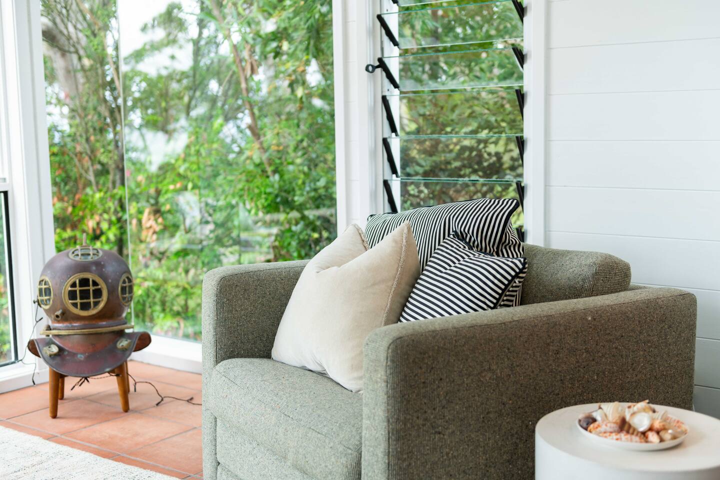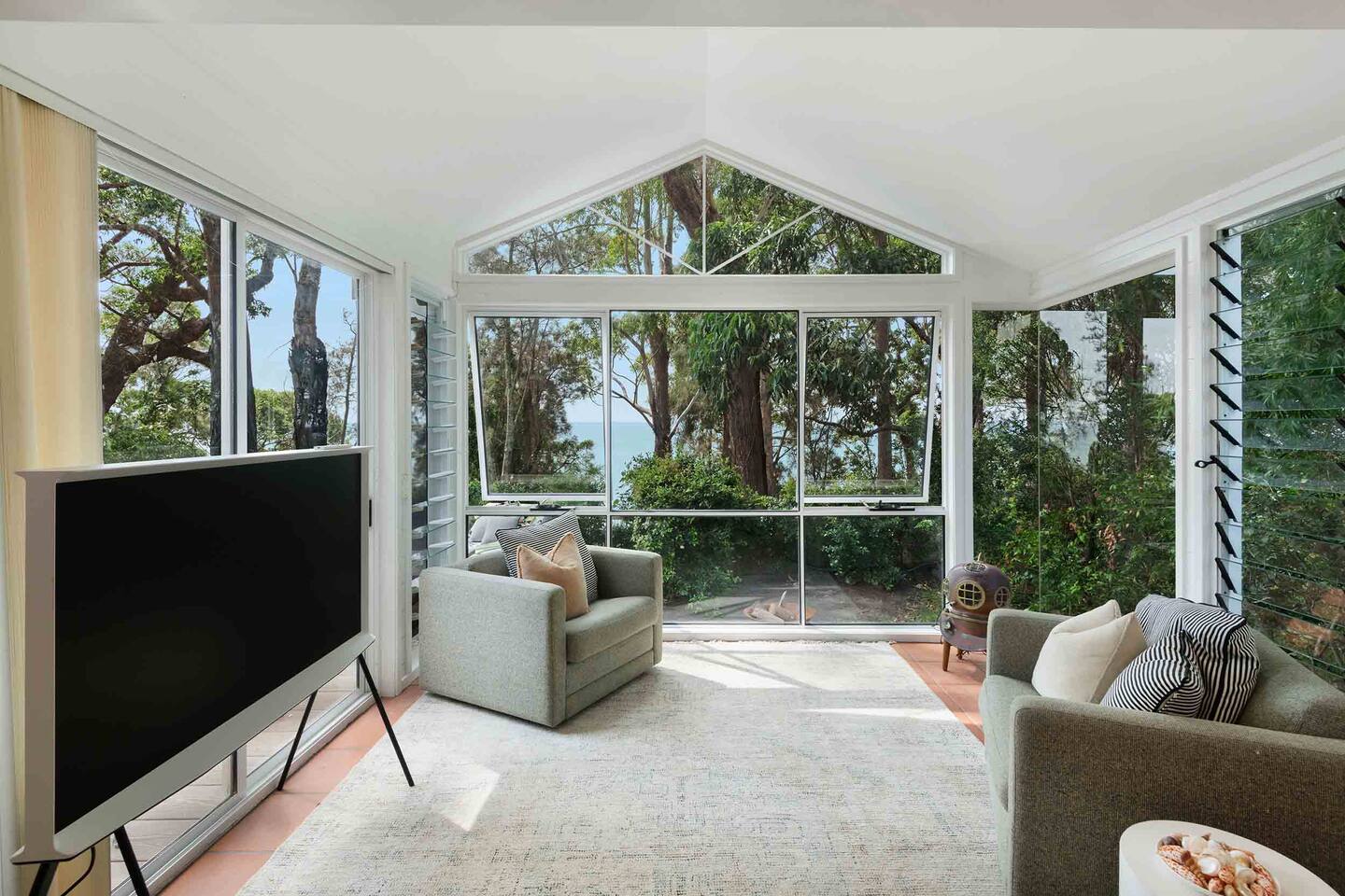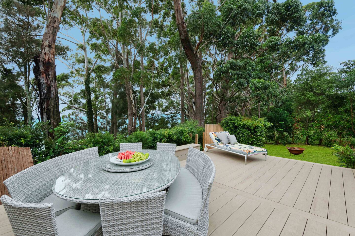 A true beachfront gem, Amethyst boasts some of the best views in Jervis Bay with an incredible outlook over Orion Beach. Enjoy its huge outdoor deck & leafy garden complete with fire pit, extremely comfortable lounge, dining area & more spaces to soak up the sea air & peaceful views. Inside, this charming retro house is brimming with character. It has been curated with creative flair, celebrating its 70s roots yet bringing a modern, comfortable & artistic feel to this relaxed 5 bedroom home
