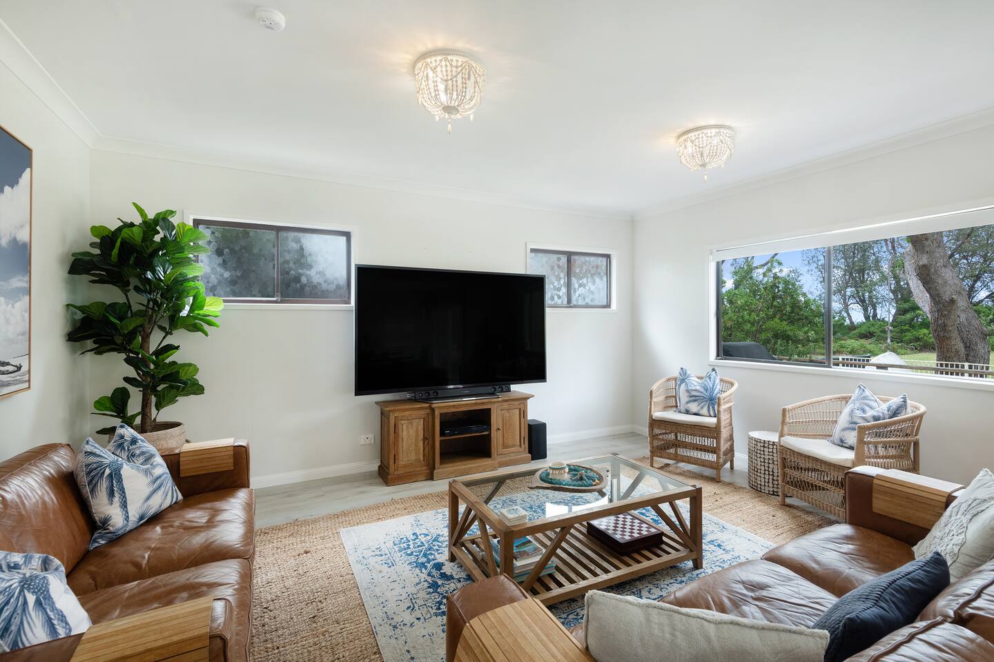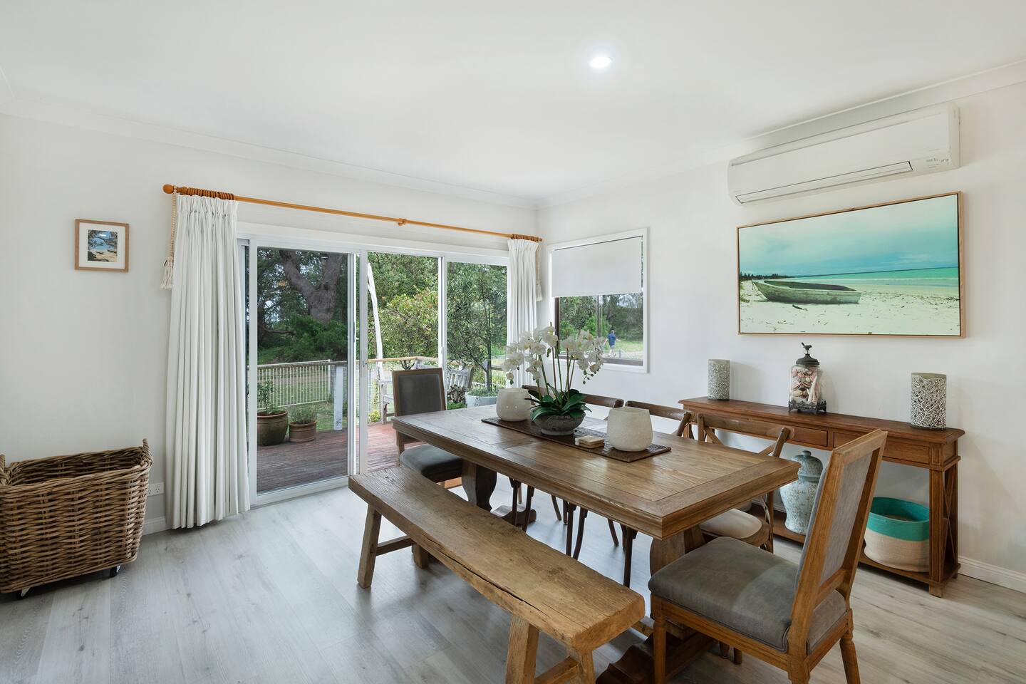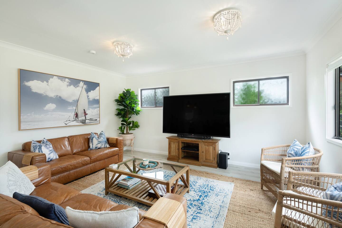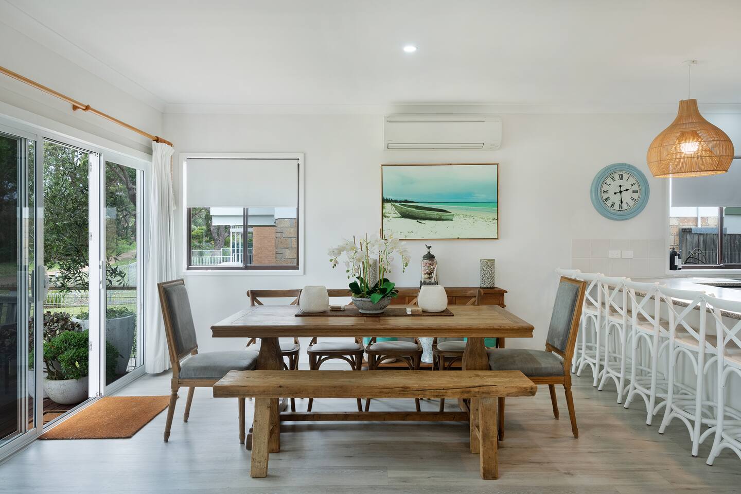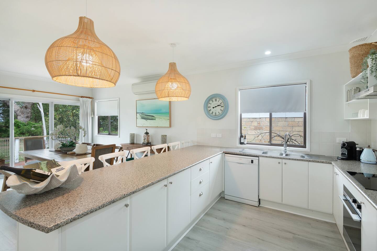 Sometimes you stumble on something truly special and Bayside, managed by The FAM Holiday Property Management in Jervis Bay, is it. Named after the original beachfront home here, this gorgeous property has been lovingly renovated & expertly styled to create a divine beachside escape. Its relaxed coastal design is curated with stunning decor, comfortable furniture, luxury finishes & appliances - including an 85 inch TV and wine fridge! With the white sands of Collingwood Beach right on your doorstep you'll feel instantly relaxed & perfectly positioned to enjoy the best of Jervis Bay. What's more you're right by the walking track that takes you either Hyams Beach or Huskisson without leaving the water's edge. This 5 bedroom property consists of a main 4 bedroom house (sleeping 7-8) and additional studio with queen bedroom, separate lounge, kitchenette & dining area and bathroom. Making it the perfect spot for family or friends to come together and relax by the water. The studio offers an extra space and additional privacy for multigenerational families, groups of friends or works well as a teenagers' retreat - complete with a smart TV The design and style is second to none with every corner of the property boasting incredible attention to detail. Meanwhile, the furnishings have been chosen to ensure maximum comfort and convenience with large lounges and an 85 inch smart TV making entertainment easy. The fully equipped kitchen boasts a wine fridge, Nespresso machine and everything in between to ensure a seamless stay. Outside, you'll find the white sand paradise, Collingwood Beach just across the pedestrian path and small sand dunes - where you'll also find a large tyre swing, an icon of any Jervis Bay childhood holiday! Stroll to the beach for sunrise and catch a glimpse of the many resident dolphins who love to dive in the early morning waves here. From the house, enjoy the sound of the waves, peace and tranquility of being nestled by the water. The back deck of the property, featuring family sized BBQ is the perfect place to enjoy with family or find a quiet nook in the grassy front yard or front verandah to escape it all. All just a stroll to local shops, cafes and restaurants in Vincentia Village, 5 minutes to bustling Huskisson and its boutique shops, cafes and breweries, a little over 5 minutes to Hyams Beach and The Booderee National Park. * Best bits of Bayside * - Absolute beachfront location - direct access to the beach out the back gate, across a small public walk way and onto the beach - Spectacular styling and interior design - a true luxury oasis - Main 4 bedroom house as well as additional studio with bedroom, lounge and bathroom - perfect for those looking to travel together but enjoy a little extra space and privacy - Brand new and truly stunning luxury main bathroom, additional 1/2 bathroom in the laundry and full bathroom in the studio - Superbly equipped kitchen including Nespresso coffee machine, large fridge/freezer, wine fridge, kettle, toaster, microwave, stove, luxury crockery and glassware - Comfortable main lounge with 85 inch smart TV, additional TV in studio. Includes access to streaming apps including Netflix, Stan etc - Multiple outdoor areas to enjoy, from the yard to deck and verandah. 2 outdoor showers - Direct access to the waterside walking track that runs from Hyams Beach to Huskisson - soak up the best of Jervis Bay without getting in the car! - 1 minute drive to local boat ramp - Short walk to local shops, cafes and restaurants, short drive to Huskisson, Hyams Beach, The Booderee National Park - Detailed in house booklet with the best insider local tips to make the most of your stay - All linen & bath towels, luxury toiletries as well as household supplies provided. BYO beach towels - Complimentary Silos Estate wine, local handmade chocolates & barista cafe coffee voucher for guests * Need to know * - Main house includes queen master bedroom, further queen room, twin room with 2 x single beds and further room with 1 single and 1 pull out single trundle bed. Studio features queen bed. Maximum sleeping occupancy 10 whilst 9 will be most comfortable. We prefer a max of 8 adults so if you're travelling with more, please send us a message to discuss the suitability - AC in main house and studio. AC units are split systems and in the main living area in the house and bedroom in the studio. Each bedroom then also has either a ceiling fan or a portable fan - Wifi
