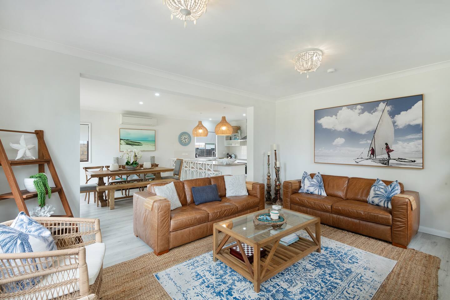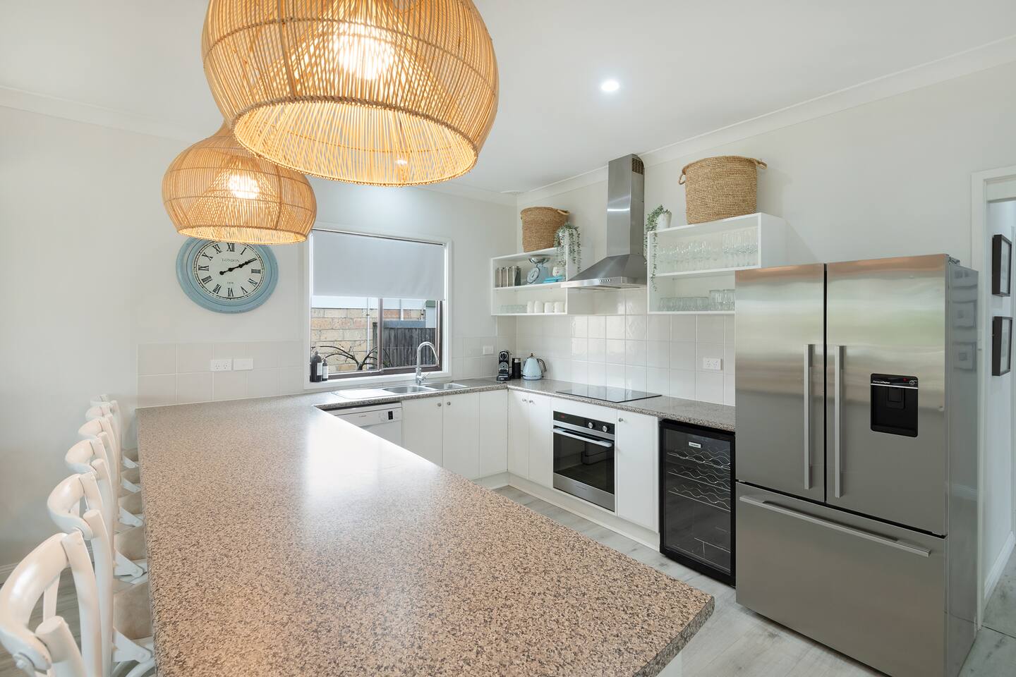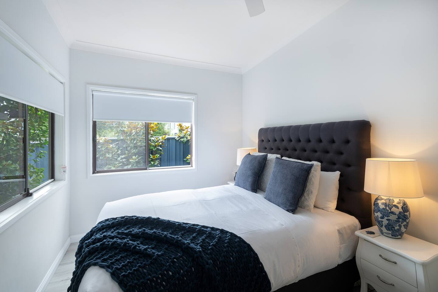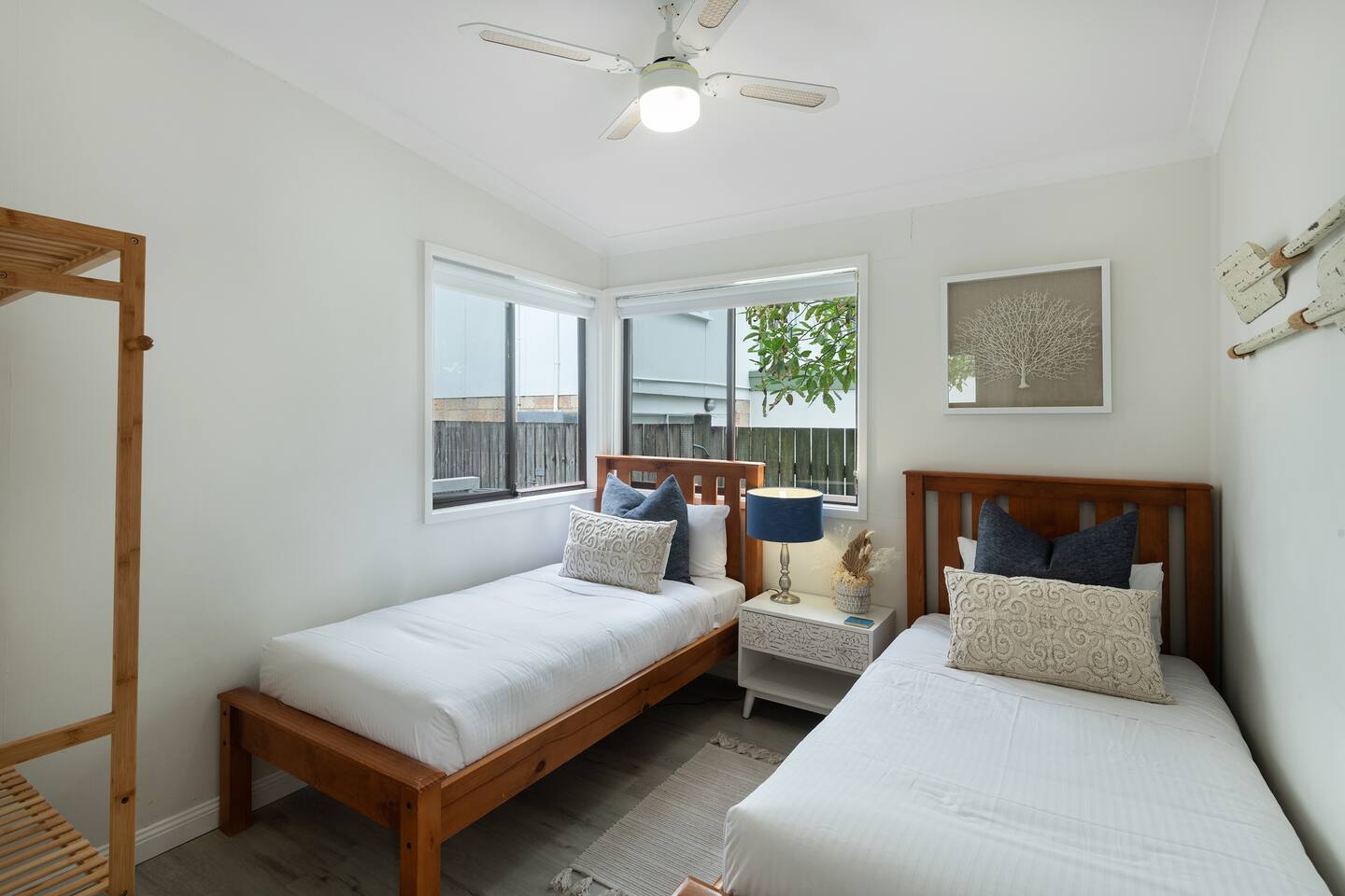 Sometimes you stumble on something truly special and Bayside, managed by The FAM Holiday Property Management in Jervis Bay, is it. Named after the original beachfront home here, this gorgeous property has been lovingly renovated & expertly styled to create a divine beachside escape. Its relaxed coastal design is curated with stunning decor, comfortable furniture, luxury finishes & appliances - including an 85 inch TV and wine fridge! With the white sands of Collingwood Beach right on your doorstep you'll feel instantly relaxed & perfectly positioned to enjoy the best of Jervis Bay. What's more you're right by the walking track that takes you either Hyams Beach or Huskisson without leaving the water's edge. This 5 bedroom property consists of a main 4 bedroom house (sleeping 7-8) and additional studio with queen bedroom, separate lounge, kitchenette & dining area and bathroom. Making it the perfect spot for family or friends to come together and relax by the water. The studio offers an extra space and additional privacy for multigenerational families, groups of friends or works well as a teenagers' retreat - complete with a smart TV The design and style is second to none with every corner of the property boasting incredible attention to detail. Meanwhile, the furnishings have been chosen to ensure maximum comfort and convenience with large lounges and an 85 inch smart TV making entertainment easy. The fully equipped kitchen boasts a wine fridge, Nespresso machine and everything in between to ensure a seamless stay. Outside, you'll find the white sand paradise, Collingwood Beach just across the pedestrian path and small sand dunes - where you'll also find a large tyre swing, an icon of any Jervis Bay childhood holiday! Stroll to the beach for sunrise and catch a glimpse of the many resident dolphins who love to dive in the early morning waves here. From the house, enjoy the sound of the waves, peace and tranquility of being nestled by the water. The back deck of the property, featuring family sized BBQ is the perfect place to enjoy with family or find a quiet nook in the grassy front yard or front verandah to escape it all. All just a stroll to local shops, cafes and restaurants in Vincentia Village, 5 minutes to bustling Huskisson and its boutique shops, cafes and breweries, a little over 5 minutes to Hyams Beach and The Booderee National Park. * Best bits of Bayside * - Absolute beachfront location - direct access to the beach out the back gate, across a small public walk way and onto the beach - Spectacular styling and interior design - a true luxury oasis - Main 4 bedroom house as well as additional studio with bedroom, lounge and bathroom - perfect for those looking to travel together but enjoy a little extra space and privacy - Brand new and truly stunning luxury main bathroom, additional 1/2 bathroom in the laundry and full bathroom in the studio - Superbly equipped kitchen including Nespresso coffee machine, large fridge/freezer, wine fridge, kettle, toaster, microwave, stove, luxury crockery and glassware - Comfortable main lounge with 85 inch smart TV, additional TV in studio. Includes access to streaming apps including Netflix, Stan etc - Multiple outdoor areas to enjoy, from the yard to deck and verandah. 2 outdoor showers - Direct access to the waterside walking track that runs from Hyams Beach to Huskisson - soak up the best of Jervis Bay without getting in the car! - 1 minute drive to local boat ramp - Short walk to local shops, cafes and restaurants, short drive to Huskisson, Hyams Beach, The Booderee National Park - Detailed in house booklet with the best insider local tips to make the most of your stay - All linen & bath towels, luxury toiletries as well as household supplies provided. BYO beach towels - Complimentary Silos Estate wine, local handmade chocolates & barista cafe coffee voucher for guests * Need to know * - Main house includes queen master bedroom, further queen room, twin room with 2 x single beds and further room with 1 single and 1 pull out single trundle bed. Studio features queen bed. Maximum sleeping occupancy 10 whilst 9 will be most comfortable. We prefer a max of 8 adults so if you're travelling with more, please send us a message to discuss the suitability - AC in main house and studio. AC units are split systems and in the main living area in the house and bedroom in the studio. Each bedroom then also has either a ceiling fan or a portable fan - Wifi