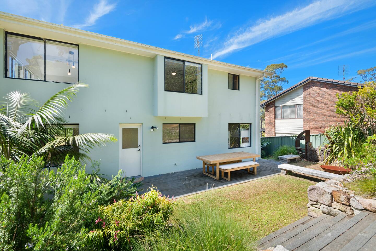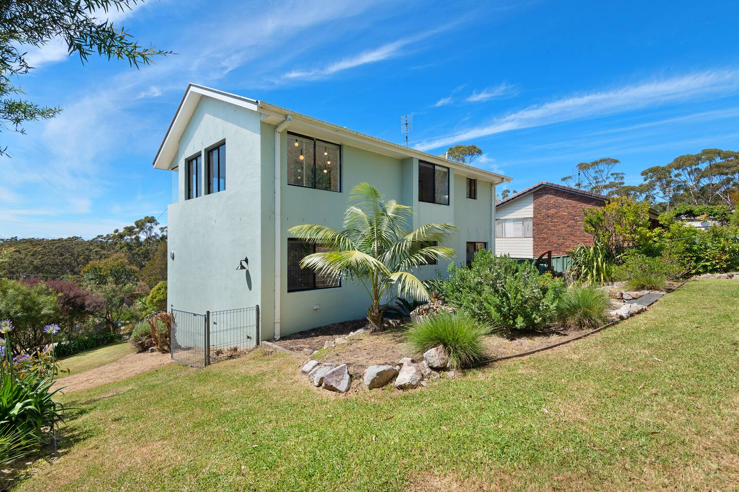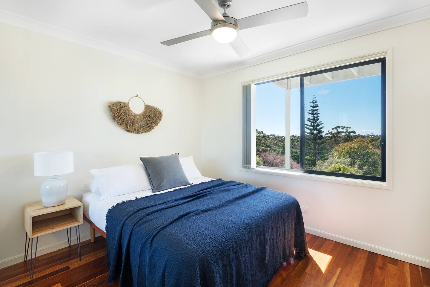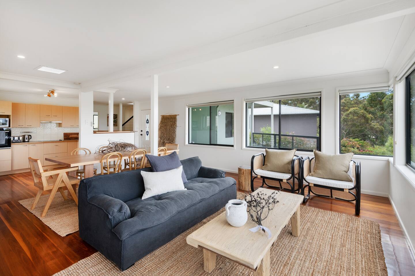Lorikeet, managed by The FAM Holiday Property Management in Jervis Bay, is a relaxed, comfortable and stylish beach house, perfect to come together with friends and family to enjoy the best of Jervis Bay. On one of the leafiest streets in Vincentia, nestled by the bush and perched above Blenheim Beach you’ll feel a million miles away from the hustle and bustle of everyday life, yet have easy access to local shops, cafes and restaurants. Enjoy incredible sunrises across views of Jervis Bay National Park and and soak up this very leafy, relaxed property. The house itself is large, drenched with natural light, boasts beautiful views and high ceilings. Split across two levels, you’ll feel immersed in nature above the treetops whilst enjoying plenty of space for everyone to relax. An older style but refreshed house with all new furnishings, Lorikeet will make you feel relaxed, yet comfortable and indulged. There’s a rustic, coastal feel, with linens, rattan and driftwood defining the interior style and focus on all the things that really matter – comfy beds, beautiful furniture and styling as well as everything you need for a family holiday. * Best bits of Lorikeet * - Situated near Jervis Bay’s most peaceful and beautiful beaches where the greens of Jervis Bay National Park meet white sands and crystal clear turquoise waters, yet only a short drive to Vincentia and Huskisson for shops, cafes, restaurants and breweries - Multiple light drenched living areas giving everyone space to relax. Both boast wraparound views of the Bay, bushland and out to Point Perpendicular at the north of Jervis Bay, but also feature TVs if you ever get bored of the view! - Beautifully styled with a relaxed, coastal vibe. All new comfortable and beautiful furniture, highest quality soft furnishings, hotel quality linen and towels - Open plan kitchen, dining, lounge area downstairs, making social cooking or relaxed meals easy. The kitchen is an older style but well maintained and fully equipped, featuring oven, stove, microwave, dishwasher, kettle and toaster - Huge king bed master suite with his/hers walk in wardrobe and ensuite - Mature, large garden with patio, outdoor dining area, BBQ & fire pit as well as large elevated undercover upper deck with lounge providing multiple alfresco living opportunities - Home office space with desk, Wifi - Tea, coffee, basic pantry supplies, natural cleaning products & luxury Two Good Co toiletries provided. Local barista coffee voucher, handmade sweet treat and Silos Estate wine for every guest - All linen and bath towels provided, spare beach towels - AC downstairs and ceiling fan upstairs - Near White Sands Walk, an incredible waterside bush track that leads to Hyams Beach or can be joined to the Vincentia to Huskisson walking track, taking in multiple white sand beaches before arriving in the bustling town of Huskisson - The very insider local tips shared in our in house magazine * Need to know * - Sleeps 12 plus infants (travel cot and highchair available). We prefer a max of 8 adults and 4 children. Any groups with more than 8 adults must send a request before booking. This house is not suitable for young or party groups - 5 bedrooms including 1 king with large walk in and ensuite, 3 queens and 1 bunk room with 4 single beds. Upstairs you’ll find the master king room and 1 queen, whilst the further 2 queens and bunk room are situated downstairs - 2 bathrooms, 1 on each level. Note the upper bathroom is the ensuite to the master bedroom. Additional toilet in laundry - Two living areas both with TVs - one TV is just free to air and the other has an Apple TV connection to access apps. Downstairs lounge area by open plan kitchen / dining space. Upstairs a further large lounge area features home office space - Internal laundry with washer and dryer - Off street parking on our driveway - Note this is an older property but well maintained and with brand new furniture, décor and styling meaning you’ll feel comfortable yet relaxed - Pets are welcome - on the condition that guests discuss their pet and its suitability with us in advance. Pets must not go upstairs (on carpet) or on furniture. There is plenty of space downstairs for them and in our fenced yard. All pet mess must be cleaned up and any excessive dirt or damage will be charged.
