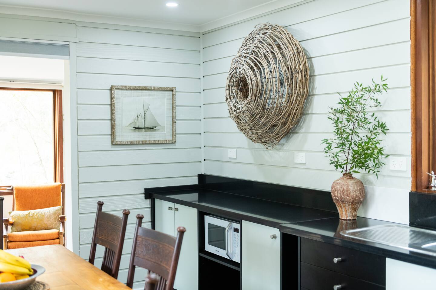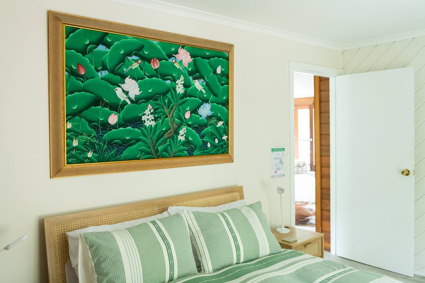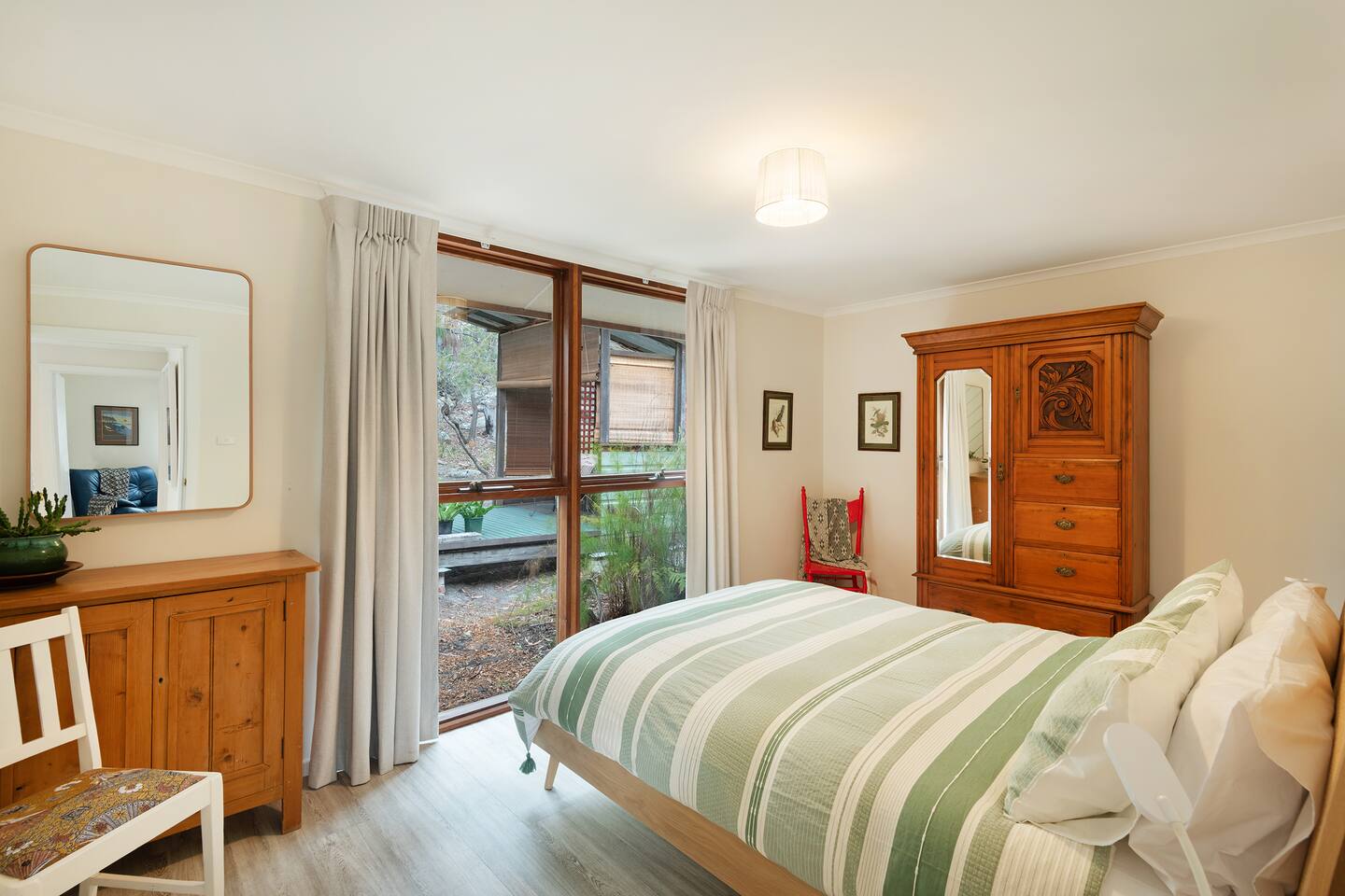 If you're looking for somewhere to truly relax in nature yet still be close to all that Jervis Bay & St Georges Basin have to offer, look no further than Meribella, managed by The FAM Holiday Property Management in Jervis Bay. You'll feel a million miles away from the hustle & bustle of life with daily visits from kangaroos & native birds as well as the tranquil sounds of the neighbouring Booderee National Park. Just a short stroll away, you'll find some of the best sunsets on the east coast of Australia over the water at Wrights Beach & be able to enjoy the peaceful waters of St Georges Basin to paddle, swim or boat. The house itself has been lovingly restored & renovated with a refreshed bathroom, new shower, brand new flooring, paintwork & a mix of new & restored furnishings. Its style has a designer's touch, with individual pieces carefully curated to celebrate the ocean - in honour of its name Meribella, meaning star of the sea - & nature that surrounds it. Sleeping 5 but with an oversized living area flowing onto an elevated deck & additional lounge, the house has plenty of space to enjoy & even more beauty to soak in. Please note Meribella is an adults only property - it is not suitable for children. Best bits of Meribella - Three bedroom bush cabin style home - 2 queen rooms & 1 king single - Spacious & bright with views to greenery all around the house. Multiple living spaces - Handpicked, unique style with beautifully curated, individual pieces of decor, art & furnishings that create a relaxed, stylish & intricate feel to the property - Recently renovated & lovingly restored property with charm & character - Wrap around upper deck & further back courtyard area nestled amongst bush views - Large, fully equipped kitchen with large dining area - Refreshed bathroom with shower & toilet - Large main living space, additional lounge & reading nook - All linen, towels, spare beach towels, basic household & toiletry products provided - Ten minutes from Hyams Beach, 15 from Huskisson - Beautiful evening skies with sunsets over the water of Wrights Beach just minutes away. 1 minute drive to boat ramp - In depth house magazine with extensive insider local tips to make the most of your stay Need to know - AC & gas heater - NBN Wifi, Smart TV - Washing machine - Being in a bush setting brings with it an abundance of wildlife - you are very likely to encounter possums, kookaburras, kangaroos, echidnas, lizards, insects & other wildlife. Please only choose us if you are comfortable in close proximity to wildlife & prepared to be entirely responsible for your own safety & never feed or approach wildlife