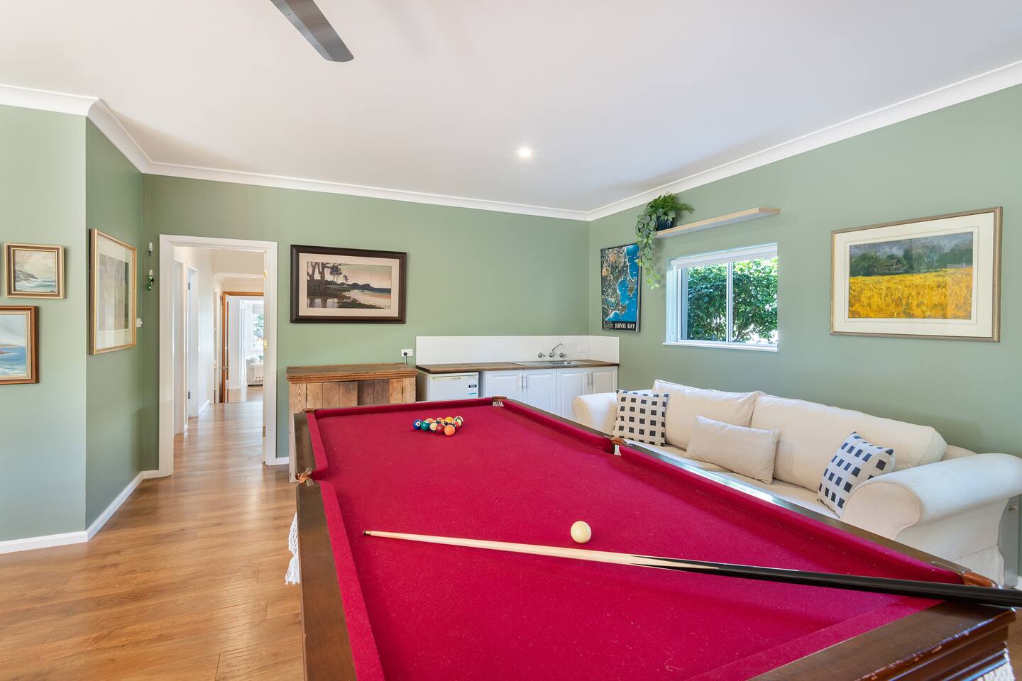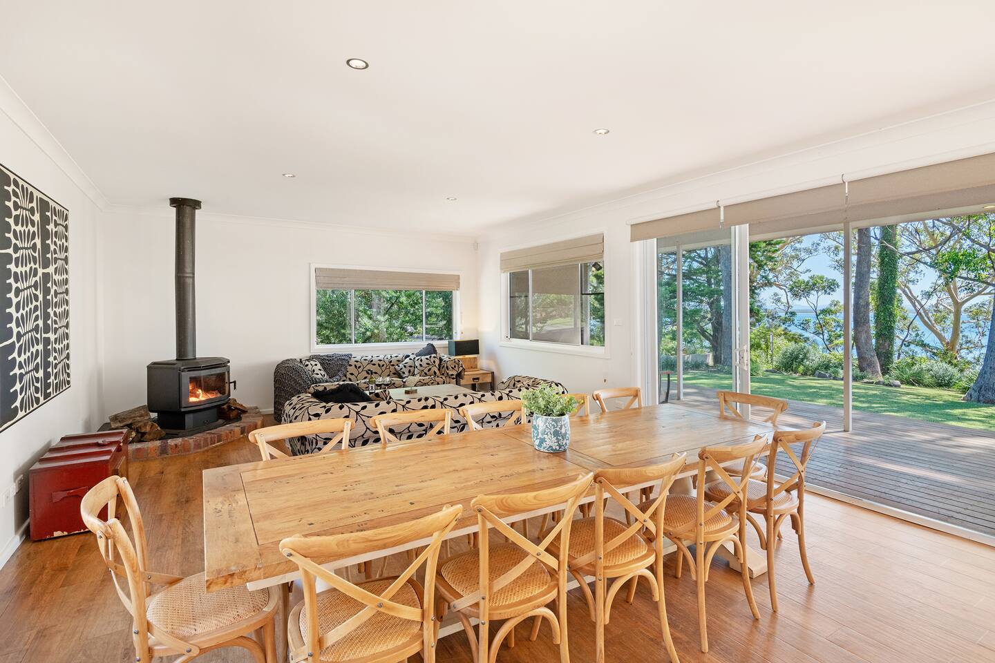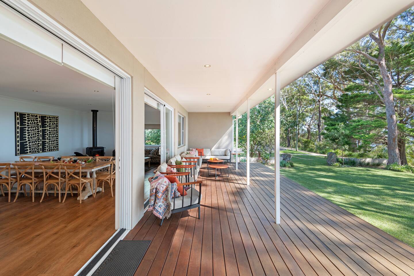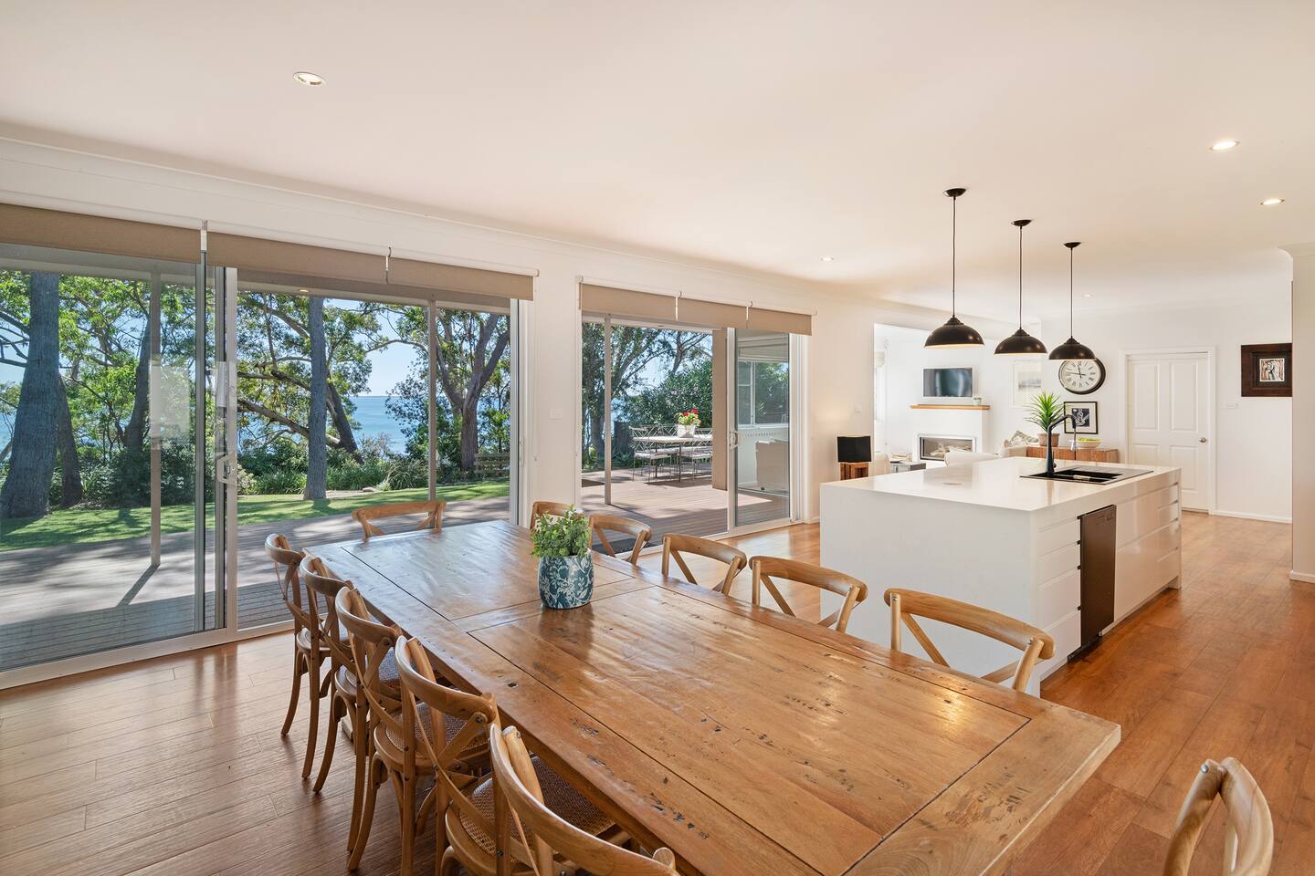 If you are looking for a truly spectacular, beachfront home in Jervis Bay, this is it. Its location is second to none, with Orion Beach at the end of the backyard, one of the calmest and quietest beaches in the bay where dolphins swim close to shore, the water is crystal clear and sands bright white. Managed by The FAM Holiday Property Management in Jervis Bay. Inside, not only will you enjoy sweeping views of the water from the kitchen, dining and main living spaces but you'll find multiple areas to relax, a pool table, log and gas fires. The space, surrounding, style and location of this property make it the perfect place to enjoy a very special trip to Jervis Bay. * Best bits of Orions Oasis * - Orion Beach is on your doorstep, stroll to the sand and listen to the waves lapping - Large deck and grassy backyard backing onto Orion Beach, further enclosed courtyard with BBQ and pizza oven - Stunning, fully equipped kitchen - Three living spaces including log and gas fires in main living area - Huge dining area with water views - Beautifully and comfortably styled - Pool table and 2 TVs for hours of entertainment - 3 modern bathrooms - AC, portable heaters and ceiling fans throughout the house - Central to everything Jervis Bay has to offer, with direct access to the walking track that runs from Hyams Beach to Huskisson, local shops just minutes away, Huskisson's cafes, shops, restaurants and breweries as well as The Booderee National Park a short drive - All linen, towels, basic household products provided. BYO beach towels - Outdoor shower - Pets allowed on request - see house rules - In depth house magazine with extensive insider local tips to make the most of your stay * Need to know * - 4 queen bedrooms - Sleeps 8 plus infants in a travel cot. This house is for family groups, it is not suitable for young or party groups - Wifi - Internal laundry