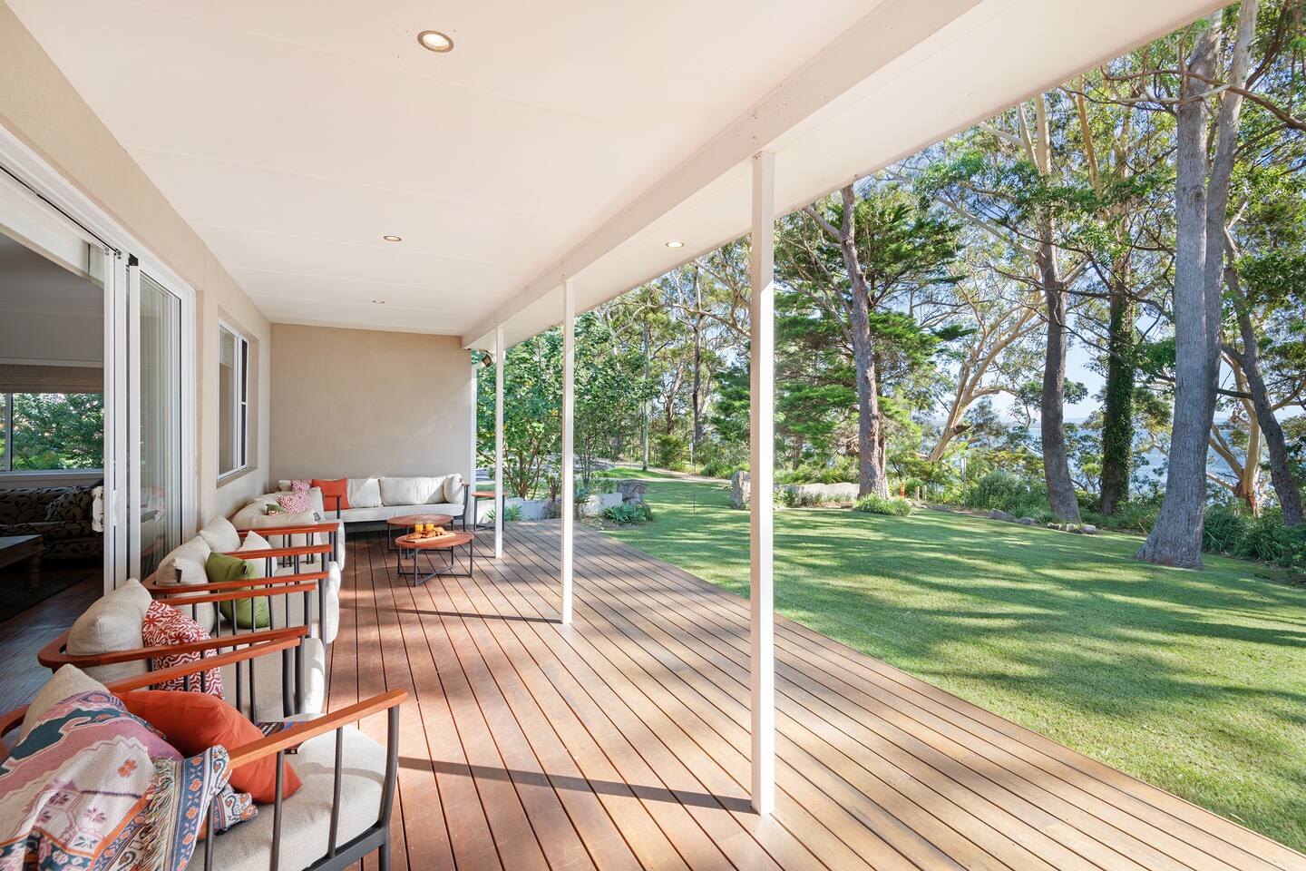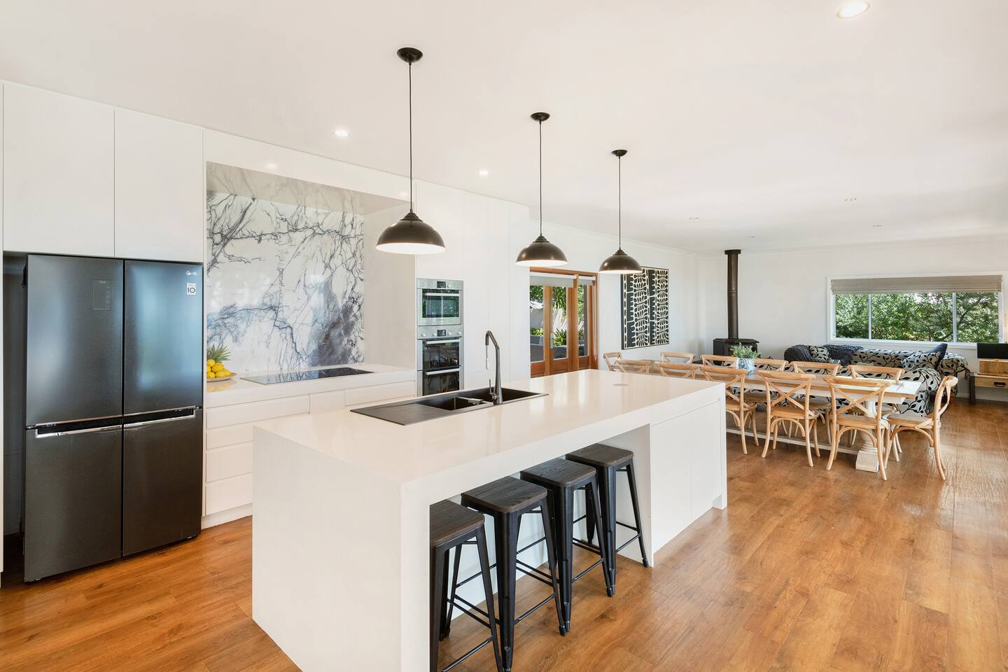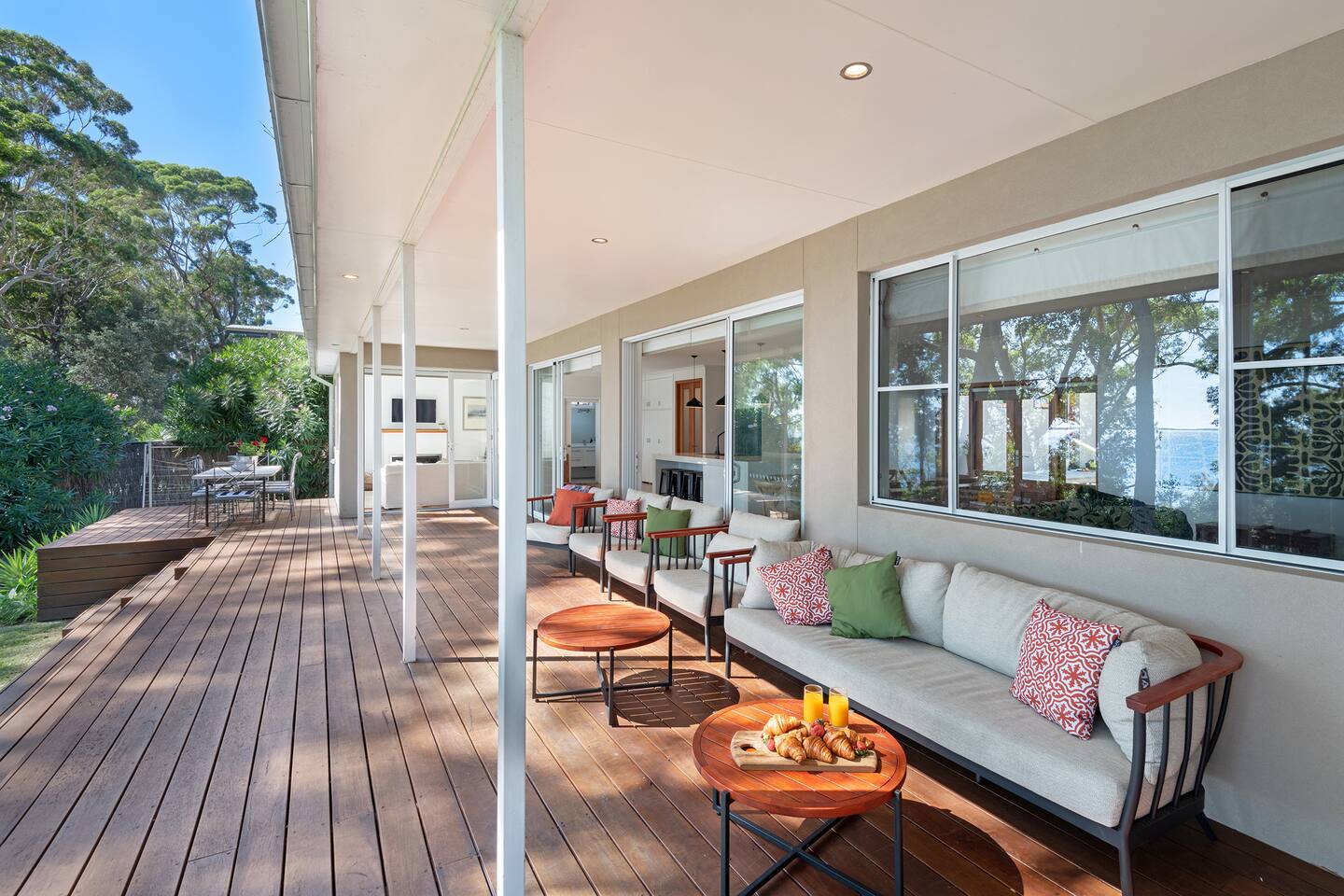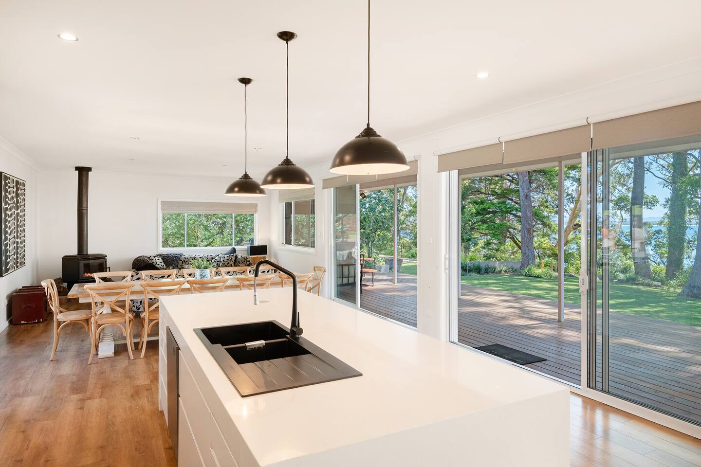 If you are looking for a truly spectacular, beachfront home in Jervis Bay, this is it. Its location is second to none, with Orion Beach at the end of the backyard, one of the calmest and quietest beaches in the bay where dolphins swim close to shore, the water is crystal clear and sands bright white. Managed by The FAM Holiday Property Management in Jervis Bay. Inside, not only will you enjoy sweeping views of the water from the kitchen, dining and main living spaces but you'll find multiple areas to relax, a pool table, log and gas fires. The space, surrounding, style and location of this property make it the perfect place to enjoy a very special trip to Jervis Bay. * Best bits of Orions Oasis * - Orion Beach is on your doorstep, stroll to the sand and listen to the waves lapping - Large deck and grassy backyard backing onto Orion Beach, further enclosed courtyard with BBQ and pizza oven - Stunning, fully equipped kitchen - Three living spaces including log and gas fires in main living area - Huge dining area with water views - Beautifully and comfortably styled - Pool table and 2 TVs for hours of entertainment - 3 modern bathrooms - AC, portable heaters and ceiling fans throughout the house - Central to everything Jervis Bay has to offer, with direct access to the walking track that runs from Hyams Beach to Huskisson, local shops just minutes away, Huskisson's cafes, shops, restaurants and breweries as well as The Booderee National Park a short drive - All linen, towels, basic household products provided. BYO beach towels - Outdoor shower - Pets allowed on request - see house rules - In depth house magazine with extensive insider local tips to make the most of your stay * Need to know * - 4 queen bedrooms - Sleeps 8 plus infants in a travel cot. This house is for family groups, it is not suitable for young or party groups - Wifi - Internal laundry