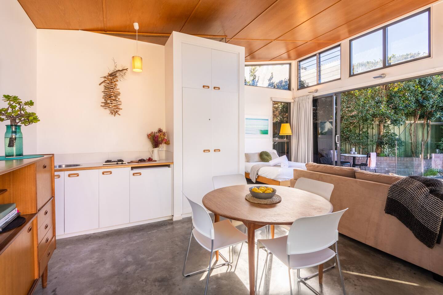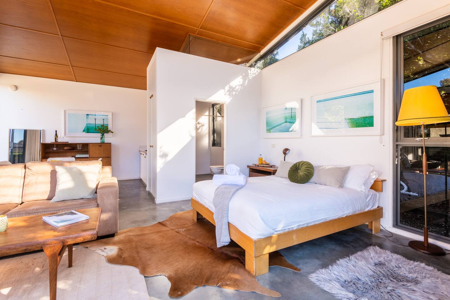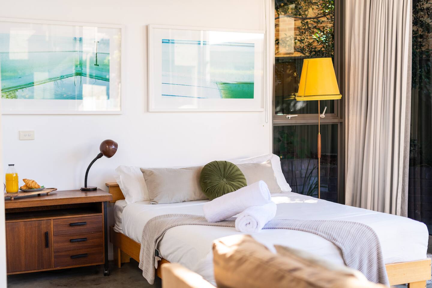 Welcome to Pool House Studio @ Due East, a boutique collection of simple, beautiful studios named after the unique and spectacular beachfront position they hold on the shores of Nelsons Beach, Jervis Bay. Managed by The FAM Holiday Property Management in Jervis Bay. Enjoy an architecturally designed property, engineered with style and function in mind, from polished concrete floors to the oversized ensuite. * Best bits of Pool House Studio @ Due East * - Stunning glass walled 'Pool House' style studio apartment with garden and 18.5 meter swimming pool - Comfortable Queen bed with luxury mattress - Relaxed retro furnishings and style paired with a beachside vibe - Wifi & smart tv - Spacious ensuite with walk in shower - Lounge area and indoor dining table - Further poolside patio - Coffee/tea facilities and supplies provided, kitchenette with basic cooking equipment, stove, toaster, microwave and mini fridge - All linen, bath and beach towels provided - Complimentary local wine, chocolates & free coffee at local cafe for all our guests - Part of a larger complex of studios and private residence * Need to know * - Perfect for couples or close friends, sleeping two in one Queen bed - Pets will be considered but strict rules do apply - chat to us before you book to ensure suitability - Additional young child welcome. Please let us know if you plan to bring a child and bring your own travel cot - We don't have laundry facilitates on site. Holidays aren’t a time to do the washing, give yourself a break and take it home - Cooking facilities are limited. We’ll give you the best tips on where to eat out at our many local cafes, bakeries, restaurants, pubs, wineries, food trucks and breweries or just take a picnic or fish’n’chip dinner to eat under the stars on the beach. We have a small kitchenette to get you started (with stovetop, basic equipment, kettle, toaster, coffee, tea, sugar provided) and the all important mini fridge for your bottles of wine but nothing further - Please note the spa is NOT operational but the pool is all yours! Laze on the beach in the morning before relaxing by the pool in the afternoon. Take in the sunrise across the water on a morning walk or enjoy a bottle of wine under the stars and beautiful evening skies. The location here is second to none, your front door is just steps from the white sands and crystal clear turquoise waters of Nelsons Beach and Plantation Point where you’ll often see dolphins swimming close to shore. Nelsons’ Due East position makes it the best possible place to catch the very first rays of the day as they dart over the horizon ahead between Point Perpendicular and Bowen Island at the mouth of Jervis Bay. In the evenings, it becomes the perfect spot to watch spectacular moon rises or settle in for a romantic evening of breathtaking star gazing. The Studios @ Due East are positioned at the start of the renowned White Sands Walk - a waterside track that ambles through bushland, passing secluded beaches until you reach the world famous Hyams Beach. This really is the heart of the south coast, with the town of Huskisson and its boutique local homewares, fashion and gift shops, buzzing cafes and award winning breweries a little over five minutes drive by car. Or reach the town by taking the 5km waterside foot/cycle path from our front door. Whilst by car, the famous Hyams Beach and nature lovers' paradise, the Booderee National Park are less than ten minutes drive. Further afield, take a short trip to explore the many more trendy Shoalhaven eateries, wineries, pubs and shops from Milton to Berry, such as Kraken Sourdough, The Growers, Greendales & The Butter Factory, Cupitt's and Silos Estate to name just a few. Or get close to nature taking by taking a cruise on Jervis Bay to see our many resident dolphins and seals. Try a snorkelling, free diving, paddle boarding or kayaking experience, or from May to November, see migrating humpback whales as they frequent Jervis Bay. * FURTHER STUDIOS AVAILABLE ONSITE FOR LARGER GROUPS OF FRIENDS OR FAMILY TRAVELLING TOGETHER *