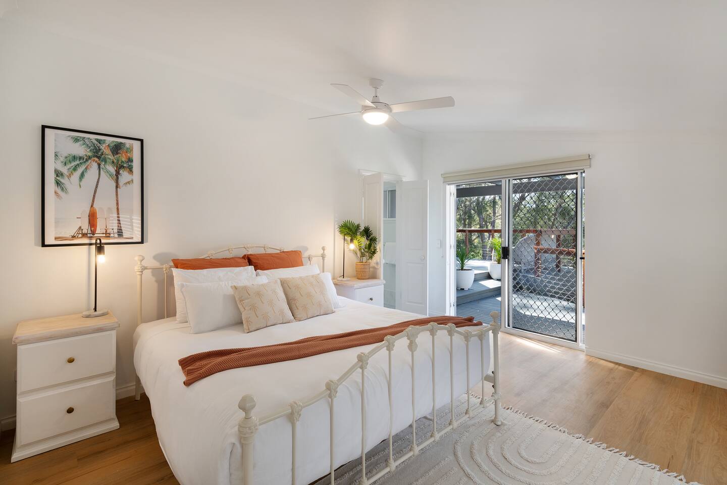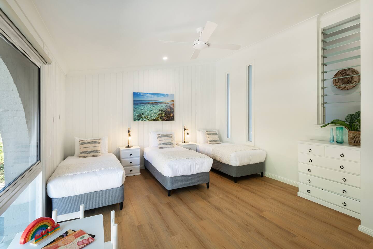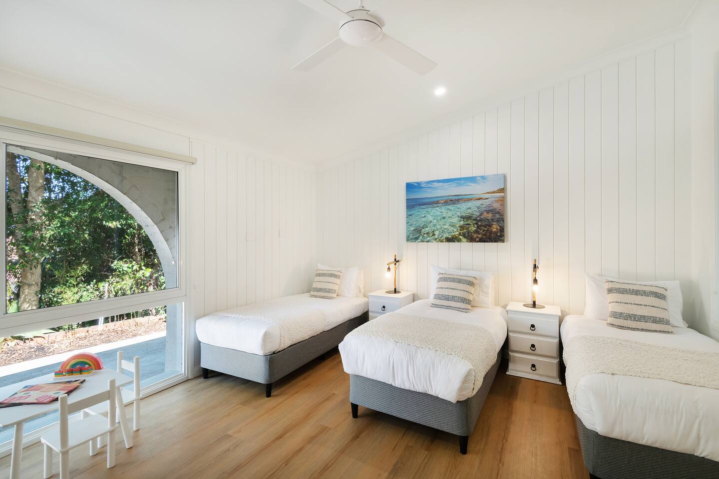Let Sunnyside, managed by The FAM Holiday Property Management in Jervis Bay, be the backdrop for your Jervis Bay escape with its charming vibe, leafy outlook and sun drenched deck, just a few minutes walk from one of the hidden gems of Jervis Bay, Greenfield Beach. With a happy and relaxed feeling throughout, it's the type of house you can settle straight into. Everything has been thought of to make you comfortable yet there's a no fuss approach. The kids can have fun with plenty of space to play in the large single room (including 4 beds) whilst the adults can spread out with a huge master king suite, further queen room, large open plan living/dining/kitchen space and additional lounge nook. The large, sunny north facing deck is the icing on the cake at Sunnyside. Surrounded by beautiful, established trees and with the sound of waves lapping in the background, it's the perfect space to relax over BBQ or snooze on the daybed. Below you'll find a grassy lawn to play or let the dogs enjoy with pets welcome here and out on our front patio, a fire pit (BYO fire wood) and seating area to enjoy evenings toasting marshmallows. Greenfield Beach, Sunnyside's local, is a white sand paradise, nestled along the famous White Sands Walks that takes you past secluded beaches, through National Park and to the ever popular Hyams Beach. One of the quietest beaches in Jervis Bay, Greenfield is truly special. Surrounded by beautiful bush you'll feel a million miles away whilst the grassy lawn, public BBQs, picnic areas and amenities make it an easy place to enjoy. Vincentia village is just a couple of minutes drive away for local shops. Huskisson, Hyams Beach and the Booderee National Park are around ten minutes drive. Choose Sunnyside for a sunny, happy, relaxed and comfortable holiday - a place to create lasting memories and soak up the joy of travel with family or friends. * Best bits of Sunnyside * - Leafy outlook, north facing sun drenched deck, just moments to Greenfield Beach - Beautifully maintained, refreshed property - Extra large master suite with king bed and ensuite - Queen room attached to Jack'n'Jill style bathroom. Large third bedroom with 4 single beds and plenty of floor space - Open plan living/dining/kitchen area looking out onto beautiful elevated deck with wrap around floor to ceiling windows - Large and well maintained, fully equipped kitchen including pod coffee machine, toaster, kettle, stove, oven & fridge/freezer - Spacious throughout with oversized hallways and additional lounge nook - Travel cot, highchair, games and toys - Pets welcome with grassy lawn for pets to enjoy - see house rules for pet conditions - Fire pit and seating area - Detailed in house booklet with the best insider local tips to make the most of your stay - All linen & towels, luxury Two Good Co toiletries as well as household supplies provided. Spare beach towels. - Complimentary Silos Estate wine, local handmade chocolates & barista cafe coffee voucher for guests * Need to know * - AC and ceiling fans - Internal laundry (top loader washer, no dryer) - Wifi and Smart TV