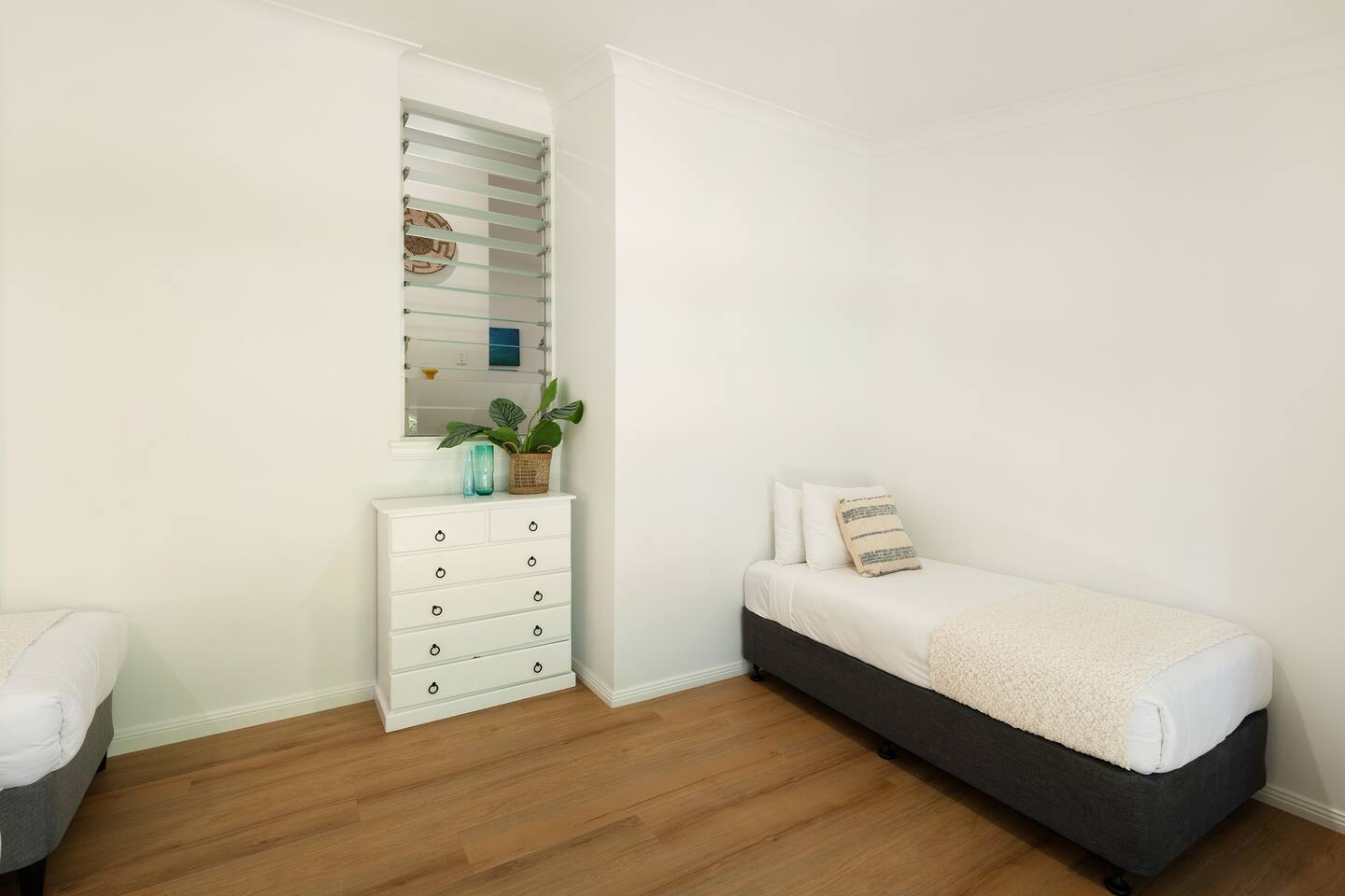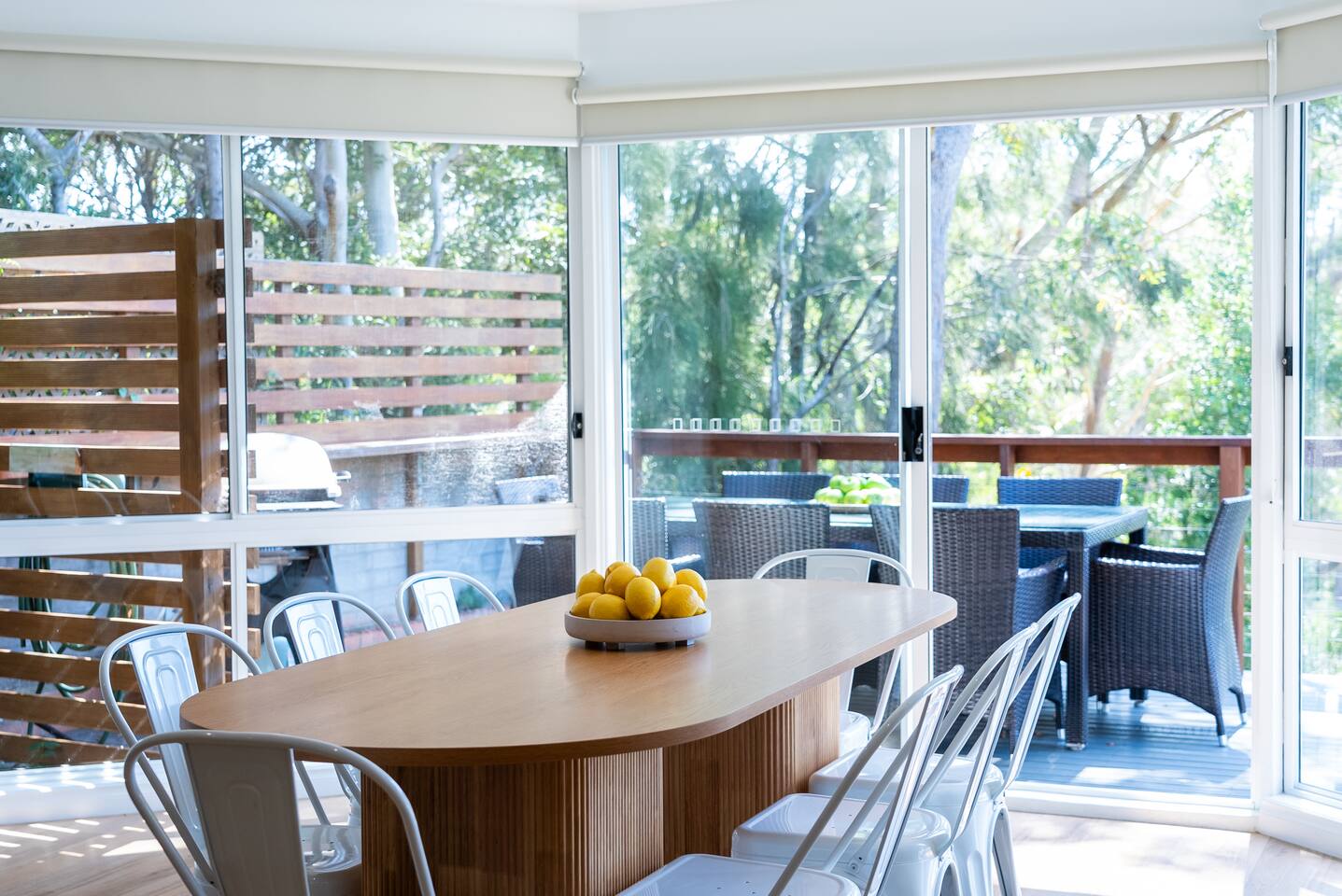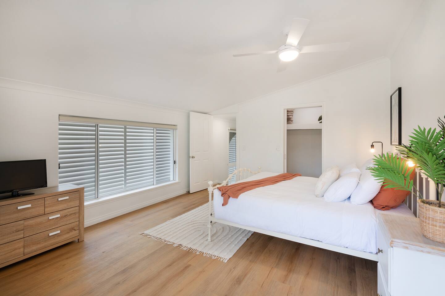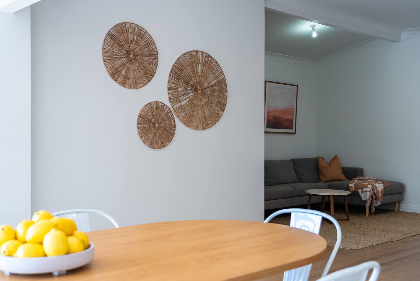 Let Sunnyside, managed by The FAM Holiday Property Management in Jervis Bay, be the backdrop for your Jervis Bay escape with its charming vibe, leafy outlook and sun drenched deck, just a few minutes walk from one of the hidden gems of Jervis Bay, Greenfield Beach. With a happy and relaxed feeling throughout, it's the type of house you can settle straight into. Everything has been thought of to make you comfortable yet there's a no fuss approach. The kids can have fun with plenty of space to play in the large single room (including 4 beds) whilst the adults can spread out with a huge master king suite, further queen room, large open plan living/dining/kitchen space and additional lounge nook. The large, sunny north facing deck is the icing on the cake at Sunnyside. Surrounded by beautiful, established trees and with the sound of waves lapping in the background, it's the perfect space to relax over BBQ or snooze on the daybed. Below you'll find a grassy lawn to play or let the dogs enjoy with pets welcome here and out on our front patio, a fire pit (BYO fire wood) and seating area to enjoy evenings toasting marshmallows. Greenfield Beach, Sunnyside's local, is a white sand paradise, nestled along the famous White Sands Walks that takes you past secluded beaches, through National Park and to the ever popular Hyams Beach. One of the quietest beaches in Jervis Bay, Greenfield is truly special. Surrounded by beautiful bush you'll feel a million miles away whilst the grassy lawn, public BBQs, picnic areas and amenities make it an easy place to enjoy. Vincentia village is just a couple of minutes drive away for local shops. Huskisson, Hyams Beach and the Booderee National Park are around ten minutes drive. Choose Sunnyside for a sunny, happy, relaxed and comfortable holiday - a place to create lasting memories and soak up the joy of travel with family or friends. * Best bits of Sunnyside * - Leafy outlook, north facing sun drenched deck, just moments to Greenfield Beach - Beautifully maintained, refreshed property - Extra large master suite with king bed and ensuite - Queen room attached to Jack'n'Jill style bathroom. Large third bedroom with 4 single beds and plenty of floor space - Open plan living/dining/kitchen area looking out onto beautiful elevated deck with wrap around floor to ceiling windows - Large and well maintained, fully equipped kitchen including pod coffee machine, toaster, kettle, stove, oven & fridge/freezer - Spacious throughout with oversized hallways and additional lounge nook - Travel cot, highchair, games and toys - Pets welcome with grassy lawn for pets to enjoy - see house rules for pet conditions - Fire pit and seating area - Detailed in house booklet with the best insider local tips to make the most of your stay - All linen & towels, luxury Two Good Co toiletries as well as household supplies provided. Spare beach towels. - Complimentary Silos Estate wine, local handmade chocolates & barista cafe coffee voucher for guests * Need to know * - AC and ceiling fans - Internal laundry (top loader washer, no dryer) - Wifi and Smart TV